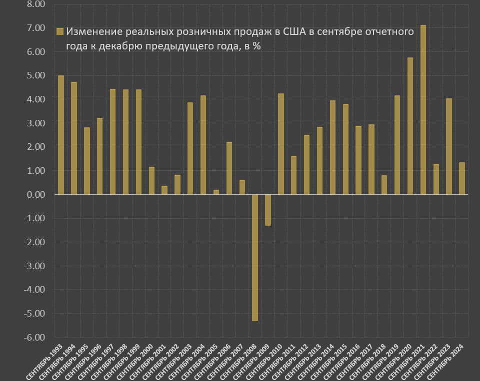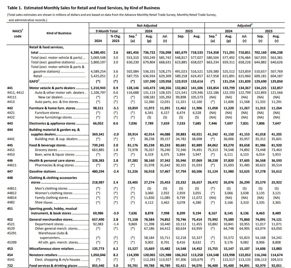 В сен.24 розничные продажи выросли на 0.43% м/м и многие были воодушевлены, проецируя в годовую динамику – до 5.3% SAAR, но это так не работает в оценке волатильного компонента, а как нужно читать отчет?
