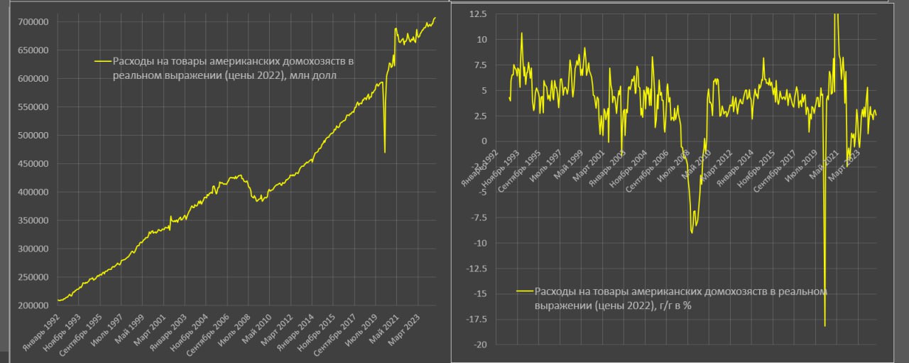 Нужно учитывать рекордную за 40 лет инфляцию, которая была за этот период. Census не представляет данных в реальном выражении, но можно реконструировать динамику, используя PCE в товарном сегменте (не путать с общим ИПЦ). BLS рисует дефляцию в товарах, поэтому в реальном выражении динамика опережающая.