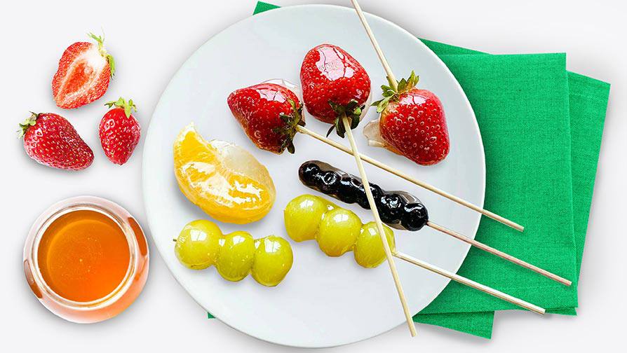 4. Опустите палочки в горячую карамель так, чтобы она покрыла фрукты и ягоды.