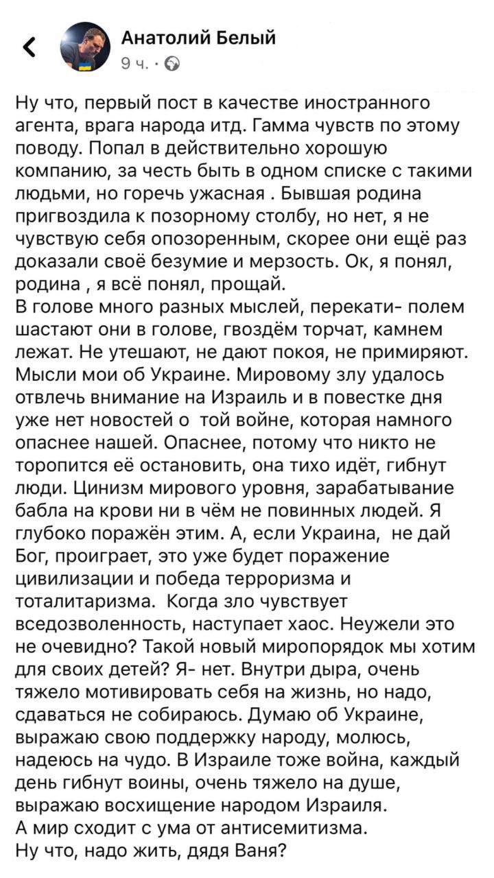 Примечательны несколько моментов опуса Белого* в соцсетях.