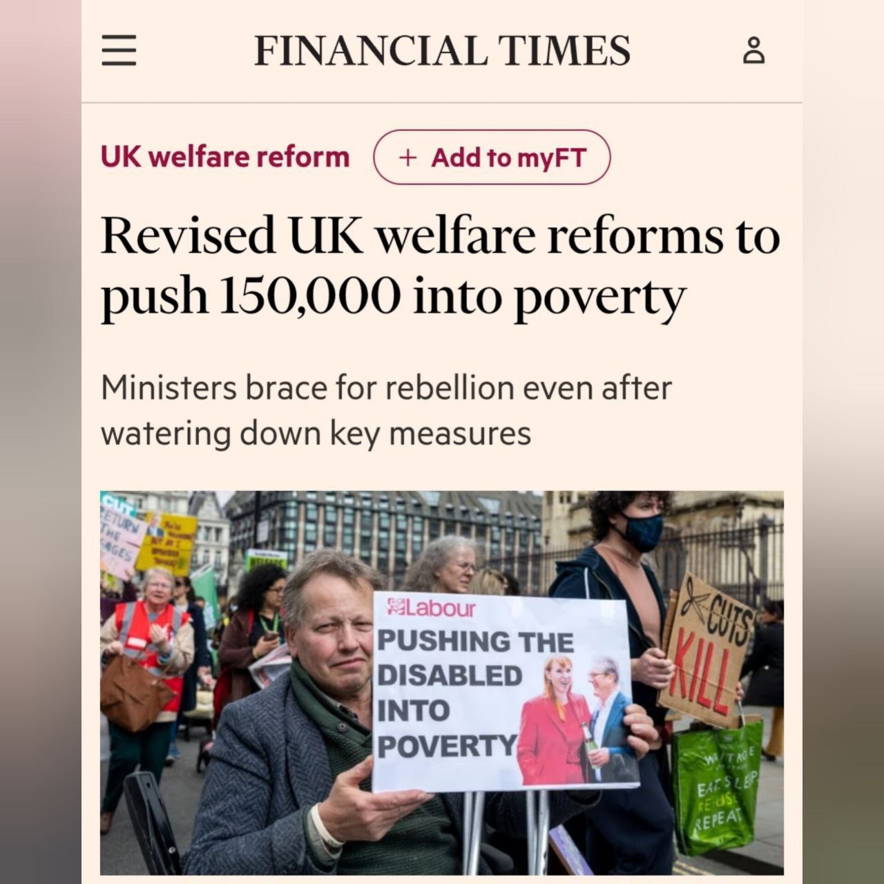 Британское издание Financial Times сообщает, что проводимая «левым» правительством реформа социального обеспечения в Великобритании приведёт к бедности ещё 150 000 человек. На фото материала мужчина с плакатом, содержание которого вынесено в заголовок поста.