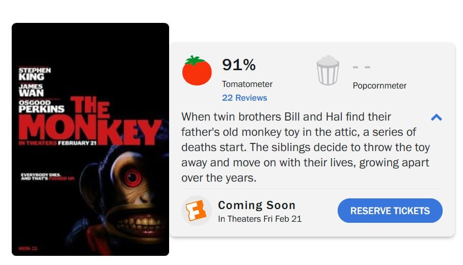 Подъехал очередной хоррор года: фильм «Обезьяна» по Стивену Кингу впечатлил критиков и набрал 91% на Rotten Tomatoes
