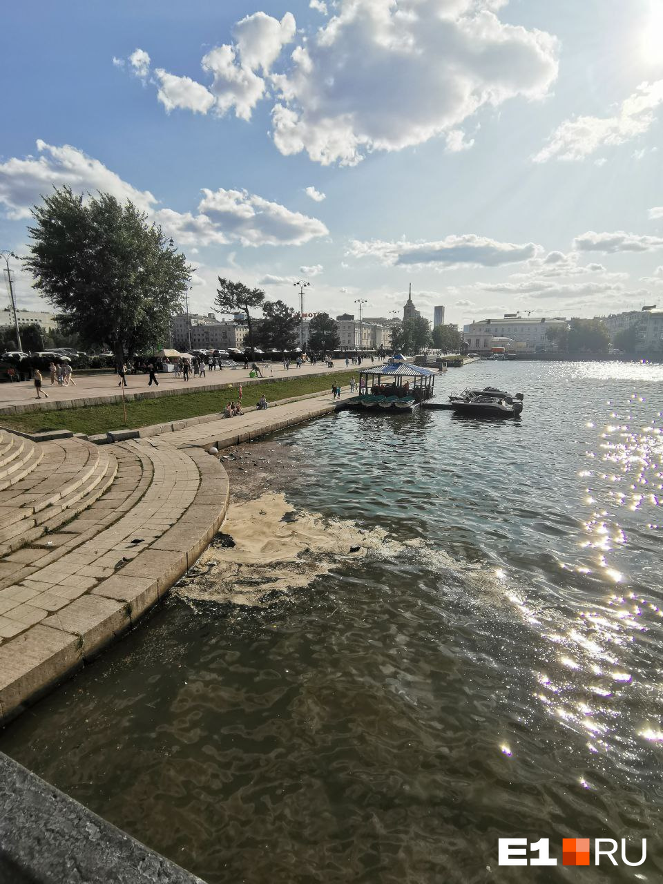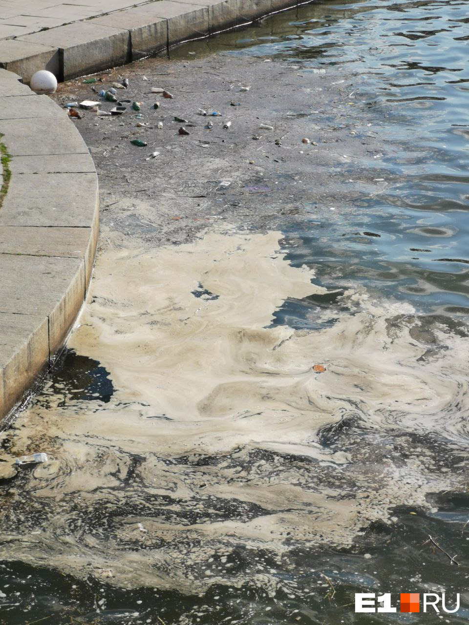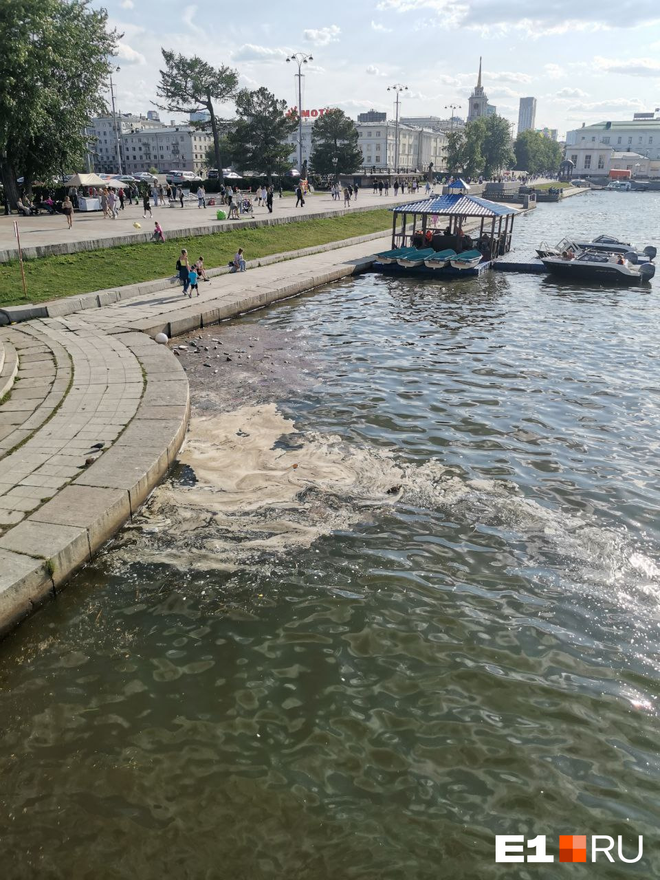 Вечером 16 июня екатеринбуржцы сняли на фото и видео воду на Плотинке. Некогда относительно чистая река теперь превратилась в настоящее болото. На берегу неподалеку от катеров плавает куча мусора, а в самой воде — масляные пятна.