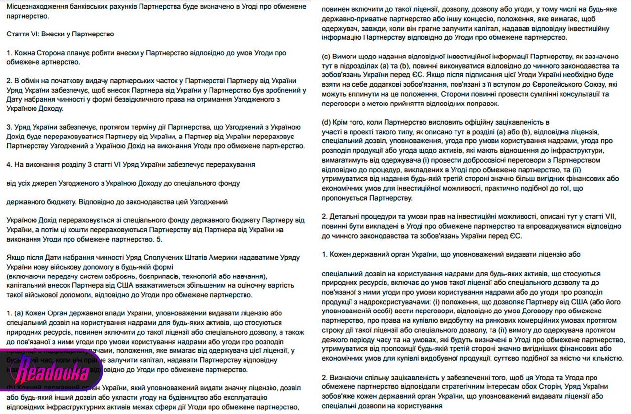 Так, «специальное разрешение на пользование недрами» будет определяться неким «Договором об ограниченном партнерстве». Те же условия действуют в отношении уже имеющихся активов Украины. Что прописали конкретно, так это обязательство Киева вносить 50% во все будущие разработки и лицензии. Обязательства США уточнять не стали. В тексте нет и заявленного ранее украинской стороной пункта о равноправном сотрудничестве 50/50.