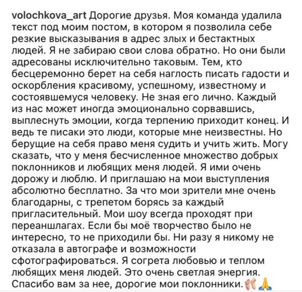 Очевидно, что Анастасия Волочкова проспалась после приезда на Мальдивы и объяснилась за вчерашний гневный пост о ненависти и зависти. Бывшая балерина уверенно заявила, что не «забирает свои слова обратно», поскольку они были адресованы хейтерам, которые вечно ей завидуют.