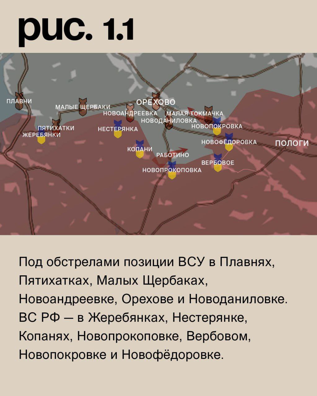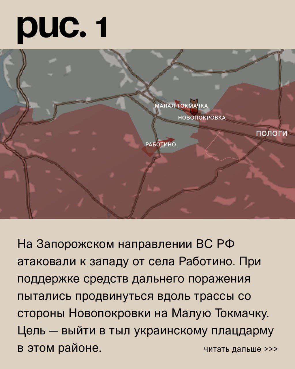 На Запорожском направлении ВС РФ атаковали к западу от села Работино. При поддержке средств дальнего поражения пытались продвинуться вдоль трассы со стороны Новопокровки на Малую Токмачку. Цель – выйти в тыл украинскому плацдарму в этом районе. Под обстрелами позиции ВСУ в Плавнях, Пятихатках, Малых Щербаках, Новоандреевке, Орехове и Новоданиловке. ВС РФ – в Жеребянках, Нестерянке, Копанях, Новопрокоповке, Вербовом, Новопокровке и Новофёдоровке. (Рис. 1)
