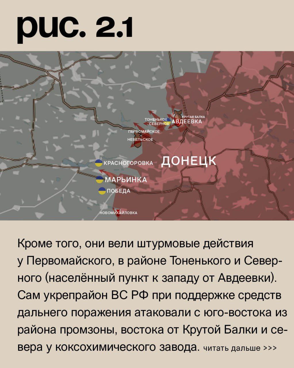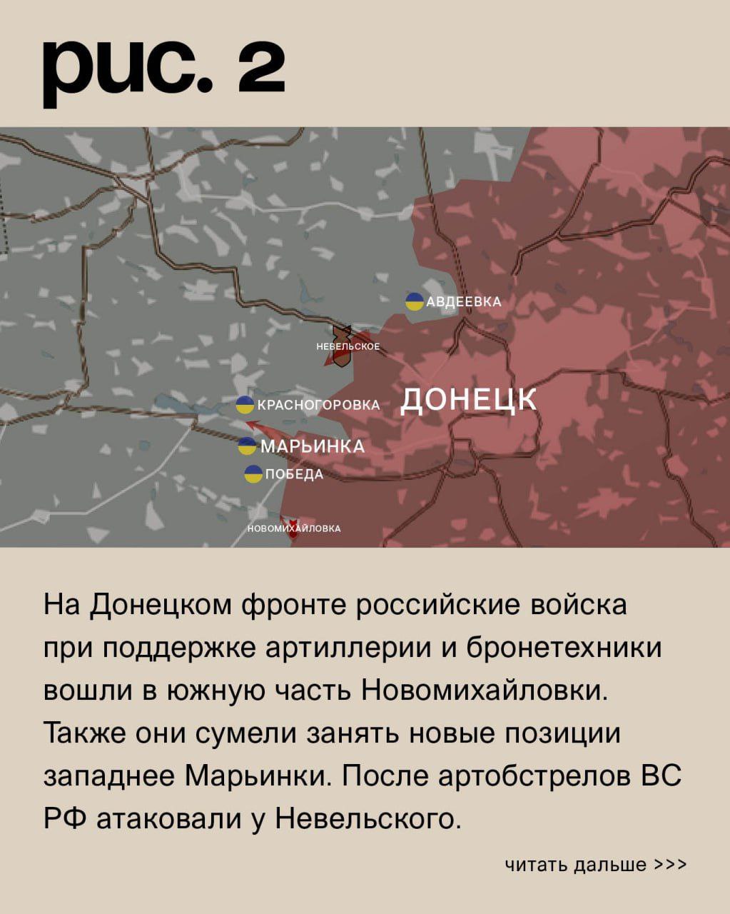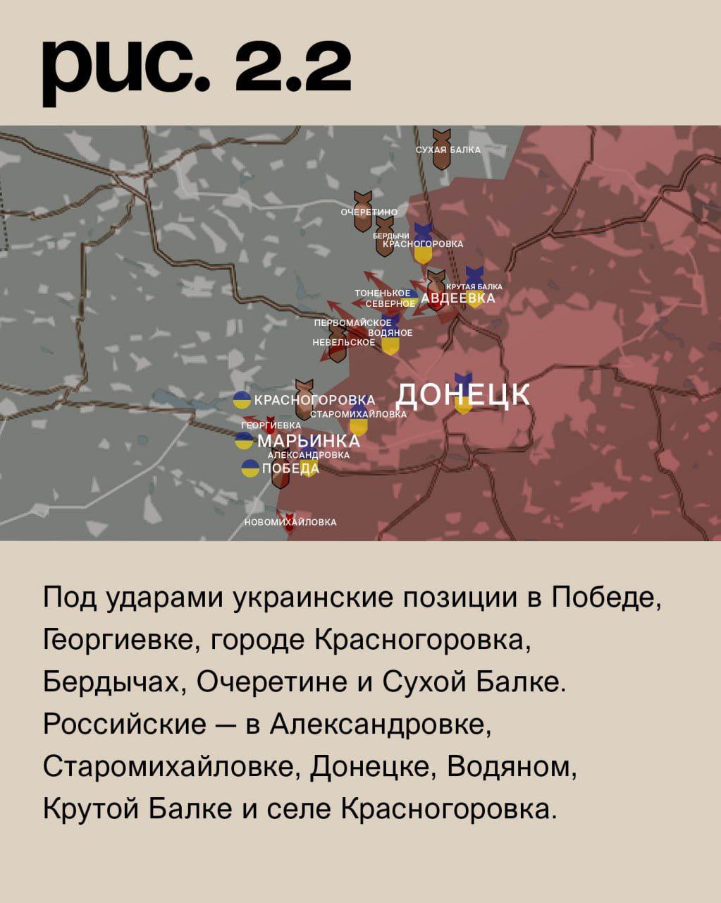 На Донецком фронте российские войска при поддержке артиллерии и бронетехники вошли в южную часть Новомихайловки. Также они сумели занять новые позиции западнее Марьинки. После артобстрелов ВС РФ атаковали у Невельского. Кроме того, они вели штурмовые действия у Первомайского, в районе Тоненького и Северного (населённый пункт к западу от Авдеевки). Сам укрепрайон ВС РФ при поддержке средств дальнего поражения атаковали с юго-востока из района промзоны, востока от Крутой Балки и севера у коксохимического завода. Под ударами украинские позиции в Победе, Георгиевке, городе Красногоровка, Бердычах, Очеретине и Сухой Балке. Российские – в Александровке, Старомихайловке, Донецке, Водяном, Крутой Балке и селе Красногоровка. (Рис. 2)