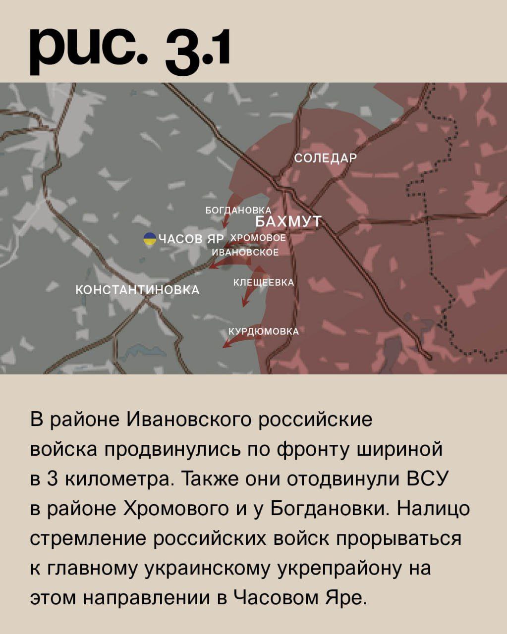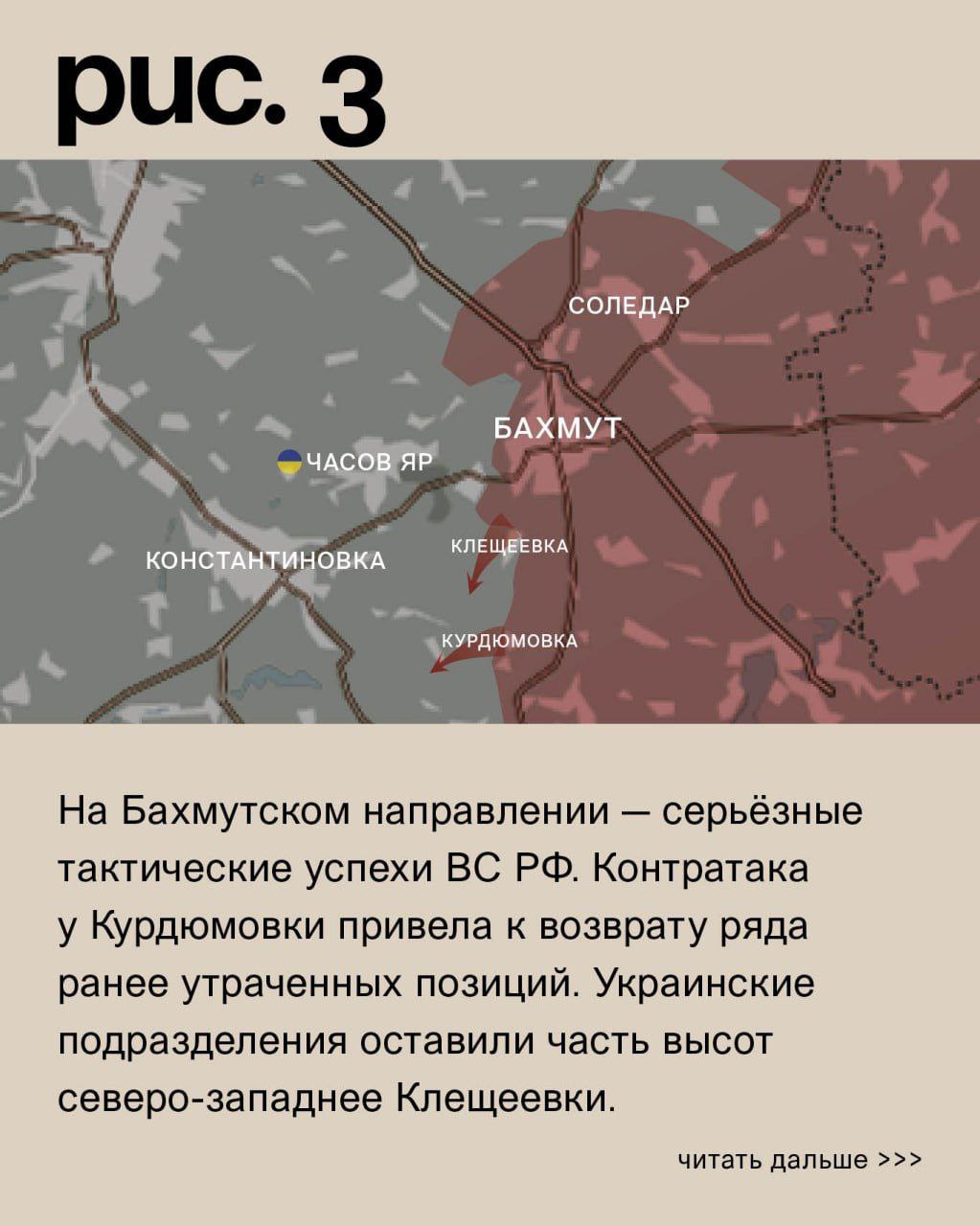 На Бахмутском направлении – серьёзные тактические успехи ВС РФ. Контратака у Курдюмовки привела к возврату ряда ранее утраченных позиций. Украинские подразделения оставили часть высот северо-западнее Клещеевки. В районе Ивановского российские войска продвинулись по фронту шириной в 3 километра. Также они отодвинули ВСУ в районе Хромового и у Богдановки. Налицо стремление российских войск прорываться к главному украинскому укрепрайону на этом направлении в Часовом Яре. (Рис. 3)