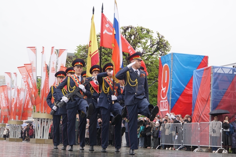 По площади торжественным маршем прошли юные морпехи, десантники, моряки и другие представители шести родов войск. Вместе с ними шагали кадеты, юнармейцы и участники школьных поисковых отрядов.