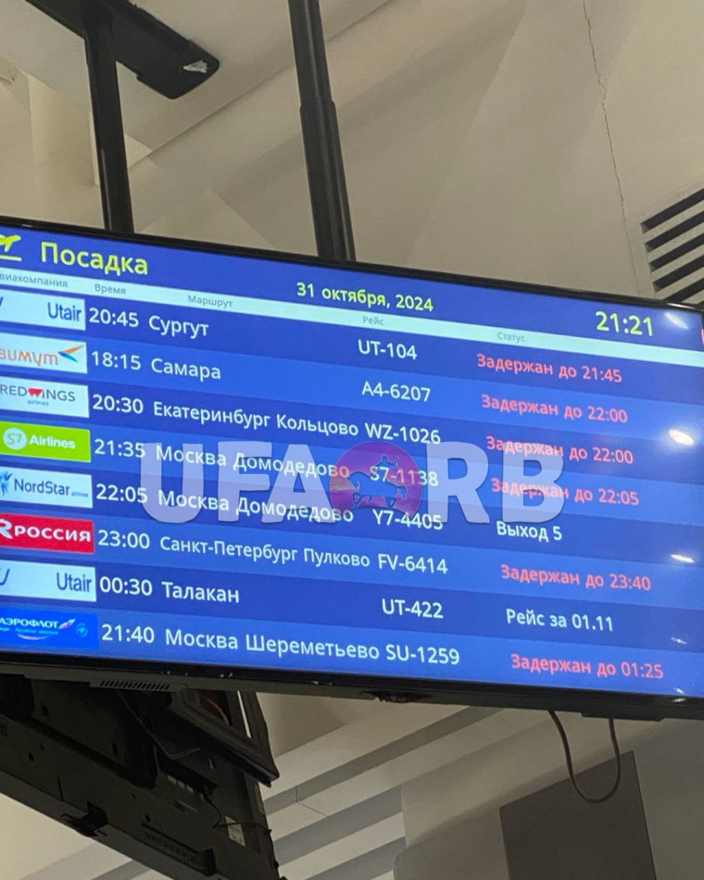 Так выглядит в данный момент табло прилета/вылета в аэропорту Уфы. Все рейсы задержаны.