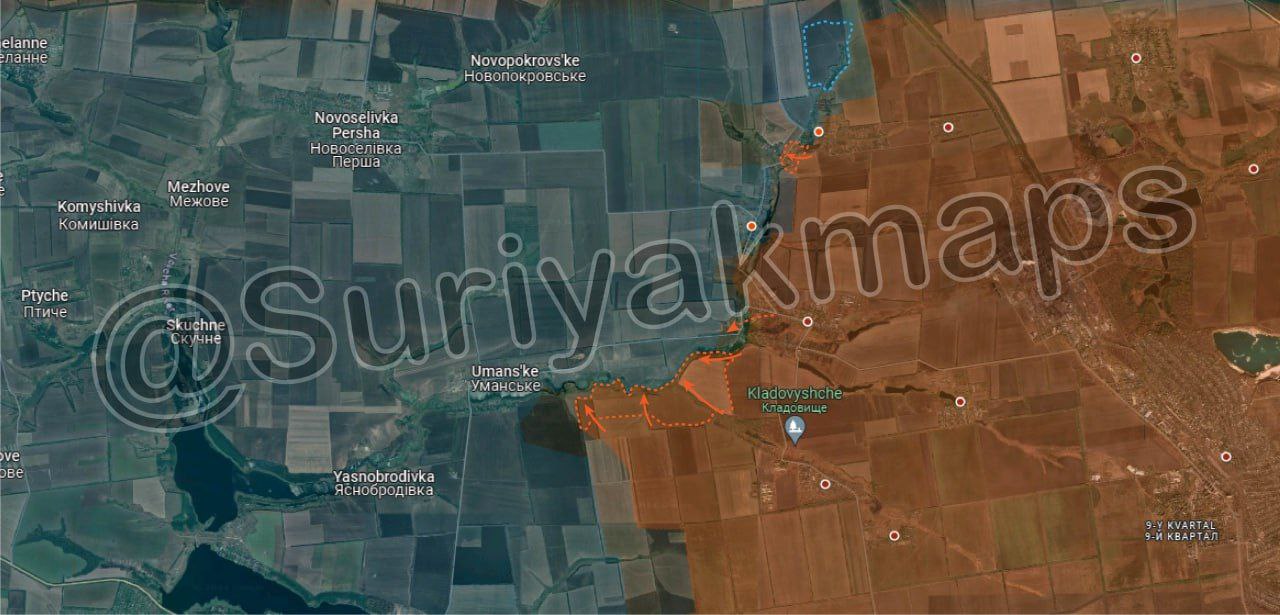❗️Международные ТГ-каналы сообщают о взятии Армией России под контроль части южного берега реки Дурная к северо-западу от поселения Тоненькое и занятии позиций менее чем в километре от села Уманское.