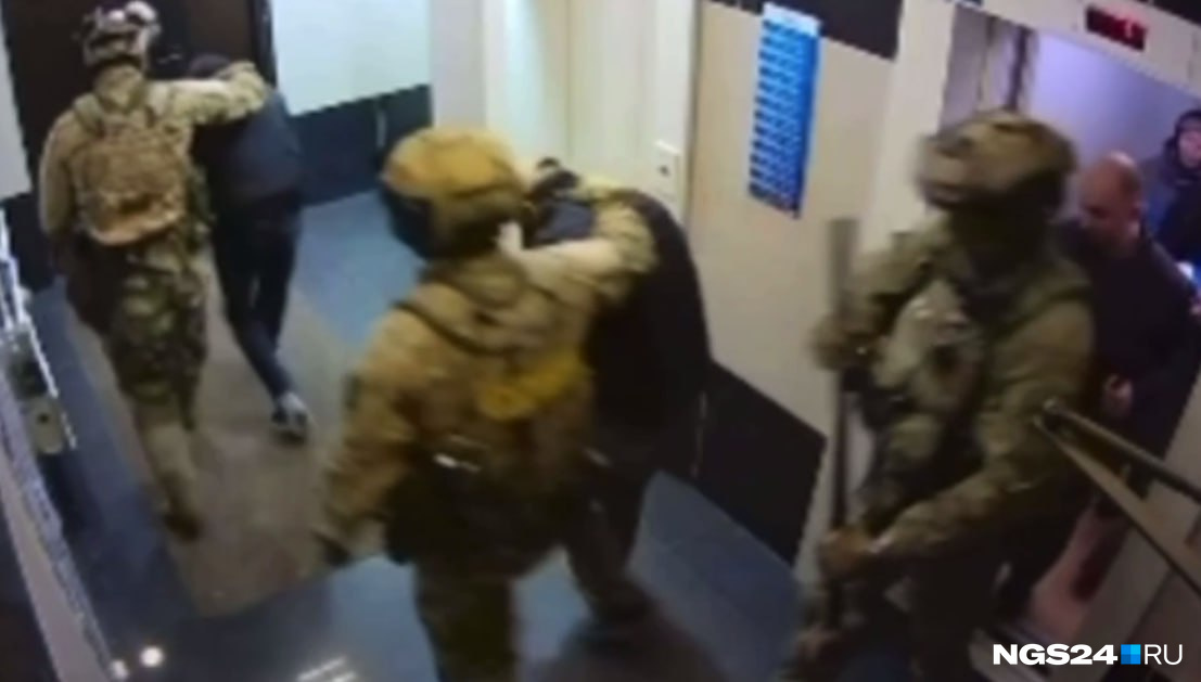 На видео с камеры наблюдения в подъезде видно, как собровцы выводят из лифта двоих мужчин, за ними идут трое человек в гражданском. У одного из них некий длинный инструмент и кейс в руках.