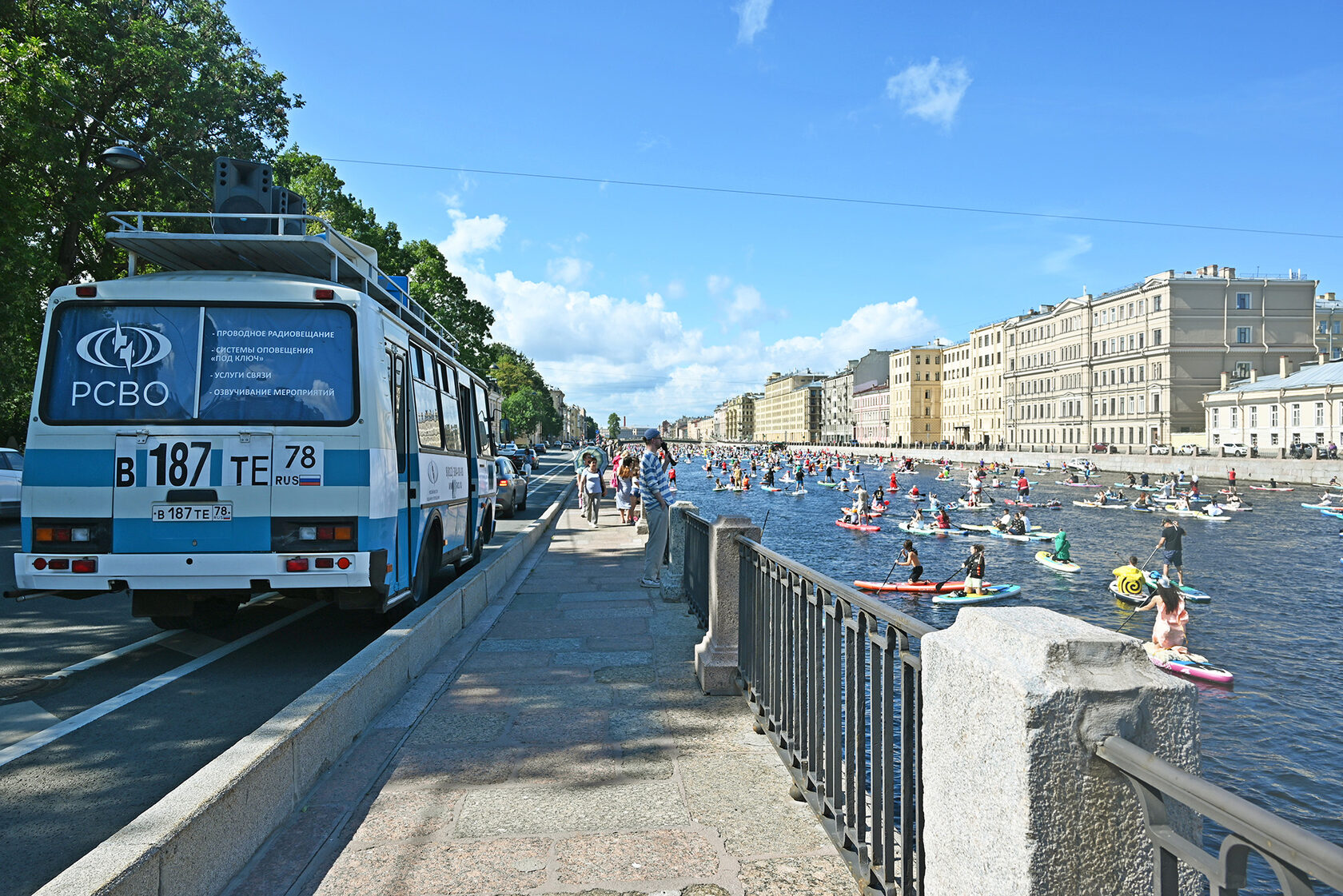В этом году участников стало намного больше. Потребовалась новая стартовая зона, которую организовали в акватории Фонтанки — от Пантелеймоновского моста до моста Белинского. Это уже более серьезное пространство, которое нам надо было озвучить, транслируя сигнал со сцены. Передвижные станции равномерно распределили на противоположной набережной Фонтанки — на всей протяженности стартовой зоны. Был организован специальный радиоканал связи всех ПЗУС с основной сценой. Задача, ввиду расстояний, сложная, но по сравнению с Главным военно-морским парадом, конечно, решается легче.