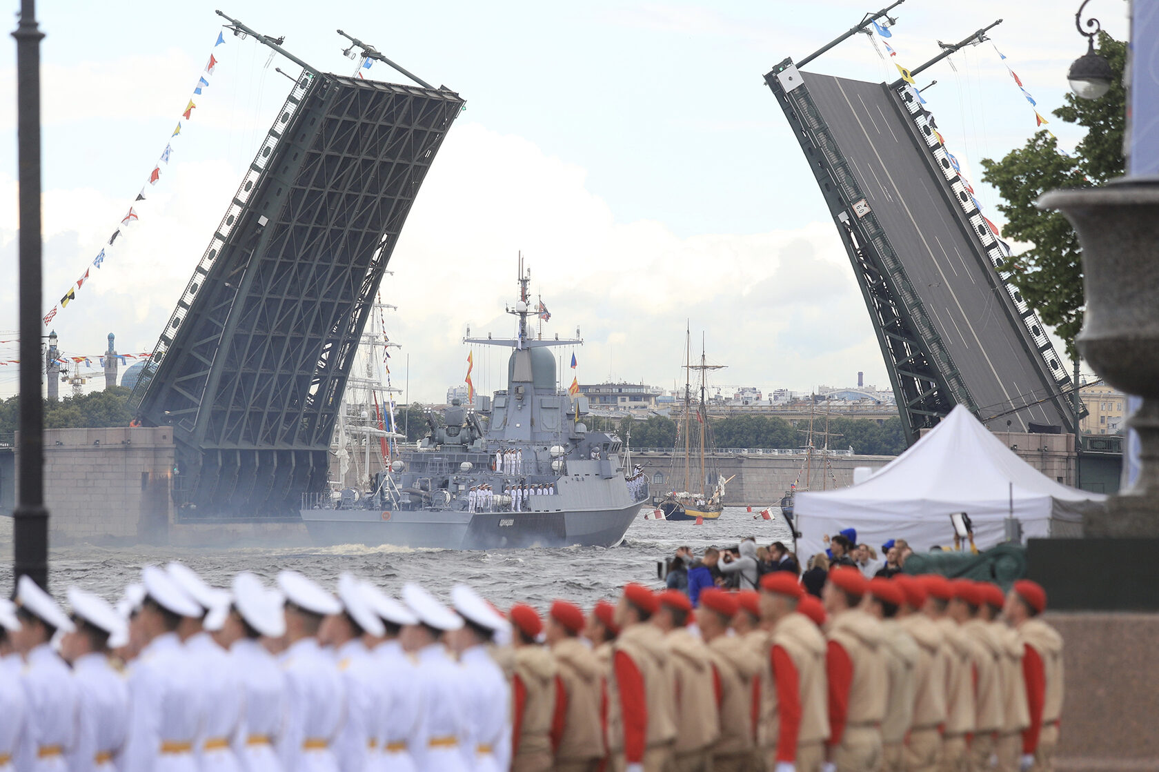 Еще одно мероприятие на высшем уровне, чрезвычайно трудное в организации. Начинается оно с того, что Главком ВМФ встречает Верховного главнокомандующего на Комендантской пристани Петропавловской крепости. Затем катер с президентом обходит строй парадных кораблей, приветствуя экипажи. После поздравительной речи на Сенатской площади начинается последовательное прохождение вдоль Адмиралтейской набережной кораблей военно-морского флота в «сопровождении» диктора, который силой голоса «дирижирует» происходящим.