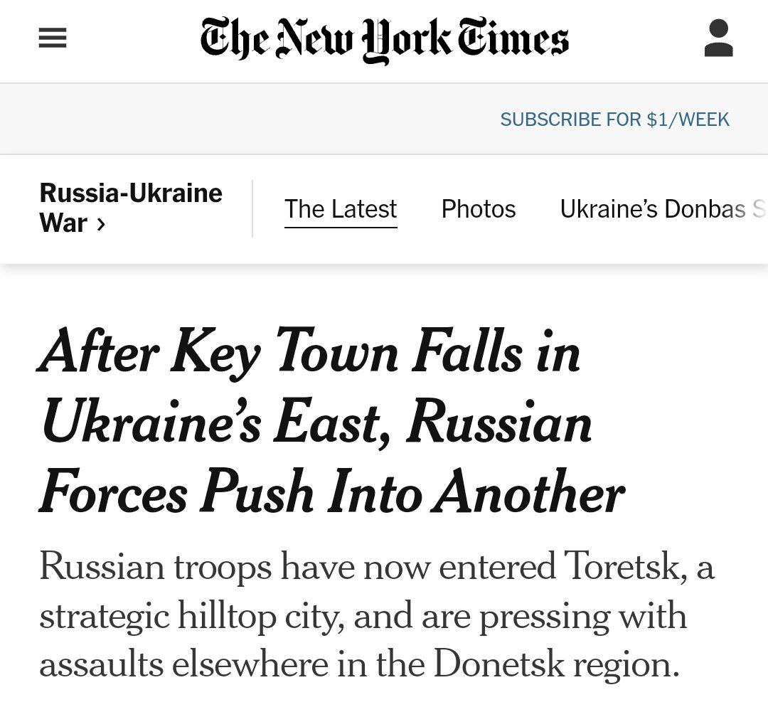 ❗️ The New York Times: за Угледаром российские войска вошли в Дзержинск (укр.Торецк) и движутся к Покровску.
