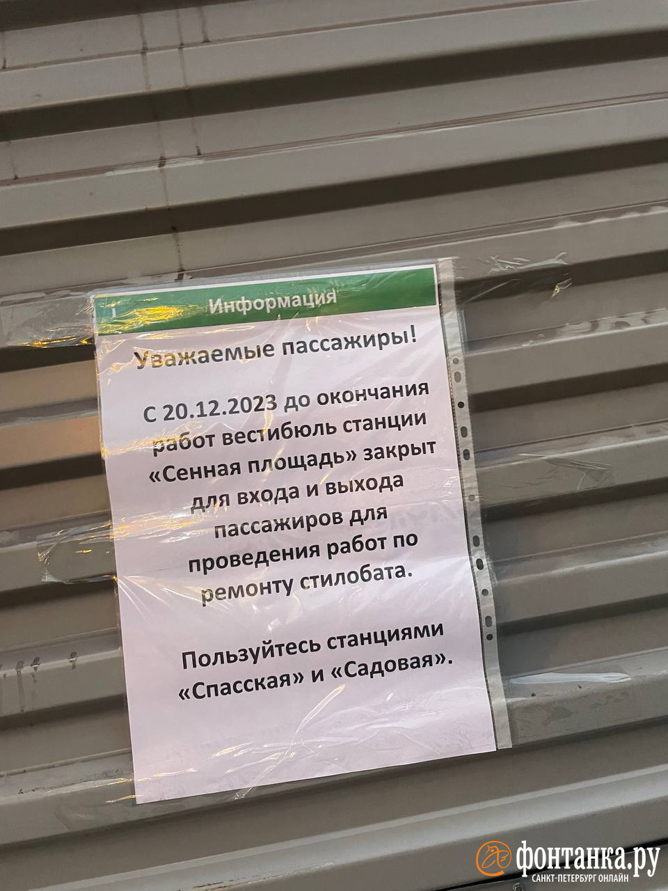 Вход в наземный вестибюль станции метро «Сенная площадь» 20 декабря по-прежнему закрыт на вход и выход. Не все горожане в курсе: некоторые подходят, удивляются, читают объявления и идут к соседним станциям, благо они рядом.