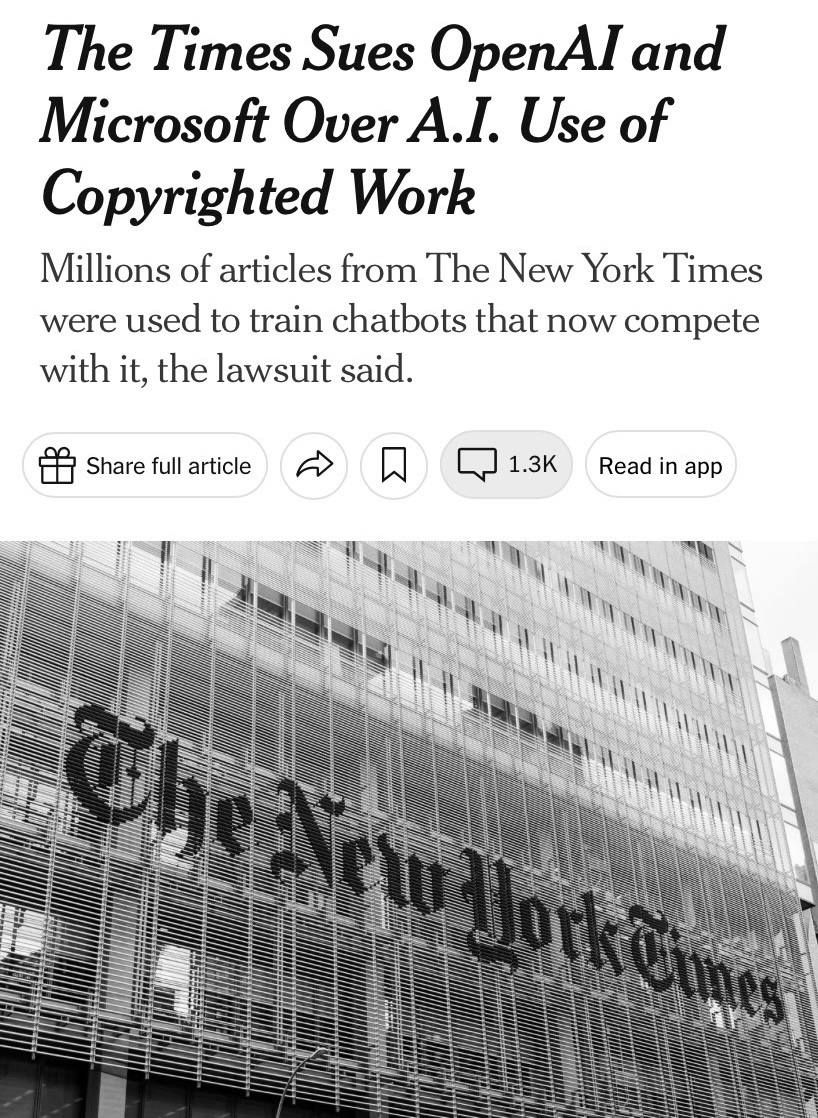 Вот оно и началось… газета The New York Times утверждает, что OpenAI и Microsoft использовали статьи, опубликованные изданием, для обучения своих чат-ботов.