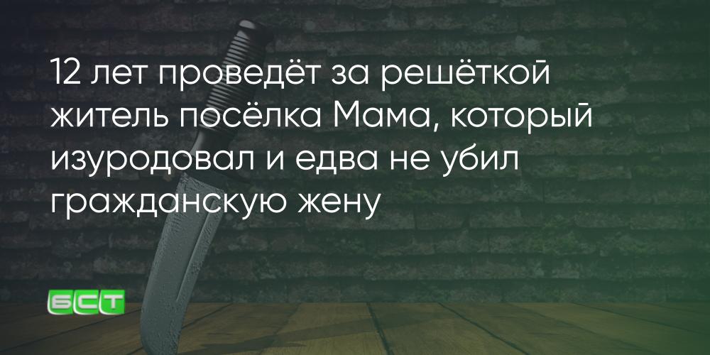 Жуткая история произошла на севере Приангарья в прошлом году. 43-летняя жительница посёлка Мама дважды едва не погибла от рук вооружённого ножом сожителя. После второго раза его арестовали. По приговору суда изверг проведёт за решёткой 12 лет. Об этом сообщает ИА «БСТ» со ссылкой на пресс-службу Прокуратуры Иркутской области.