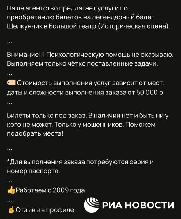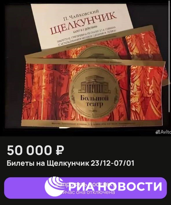 РИА Новости2 года назад ФОТО ФОТО ФОТО ФОТО Объявления о продаже билетов и браслетов для мест в очереди в кассы на "Щелкунчик" в Большом театре появились на "Авито", цена варьируется от 15 до 50 тыс рублей. Информация на этой странице взята из источника: https://t.me/rian_ru/220520Темы и тегиСоветский СоюзИскусство и КультураБольшой театр щелкунчик браслет балет Авито касса театр очередь билет щелкунчик