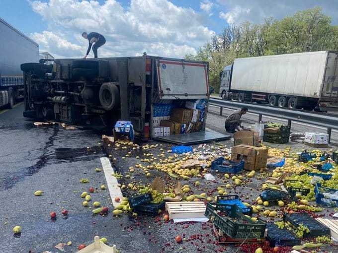 Многотонный грузовик, который переводил лимоны и яблоки, опрокинулся прямо на трассе. Водители объезжали пробку по встречке.