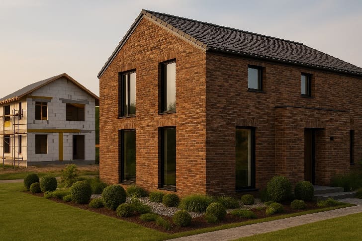 Там, где дом — это надолго, выбирают кирпич. Чаще — элитный: клинкерный, ручной формовки, привезённый с европейских заводов. Да, дорого. Да, дольше. Зато без необходимости «утеплить, зашить, декорировать и молиться, чтобы не повело».
