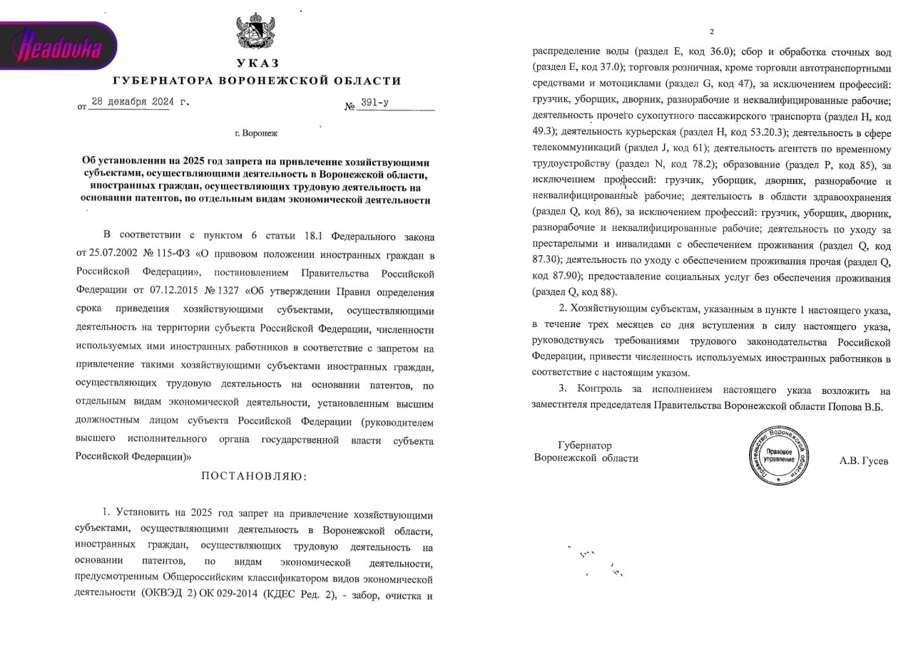 Опубликован указ губернатора Воронежской области Александра Гусева, продлевающий введенный в прошлом году запрет на определенные профессии для мигрантов. При этом расширяется и список сфер запрещенных видов деятельности. Приезжие не смогут работать курьерами, а также быть заняты в образовании, здравоохранении, торговле или ухаживать за больными. Исключение представляют только деятельность в качестве подсобного рабочего в этих отраслях — например, грузчика, уборщика или дворника.