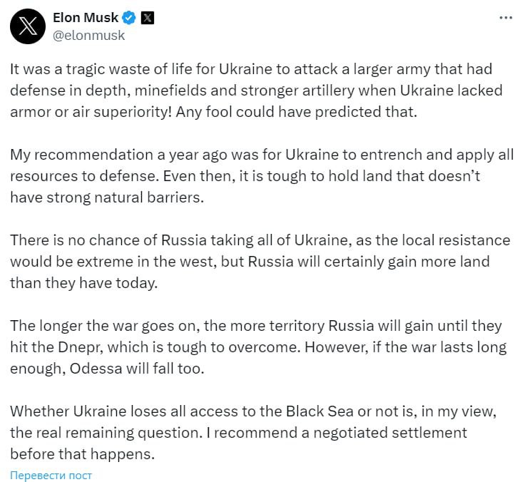 Свежий анализ и прогноз военных действий на Украине от Илона Маска.