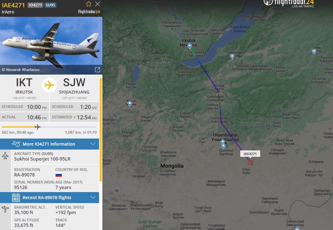 «Суперджет» «Ираэро» сейчас летит над Монголией в китайский Шицзячжуан для дозаправки, а затем отправится в Манилу.
