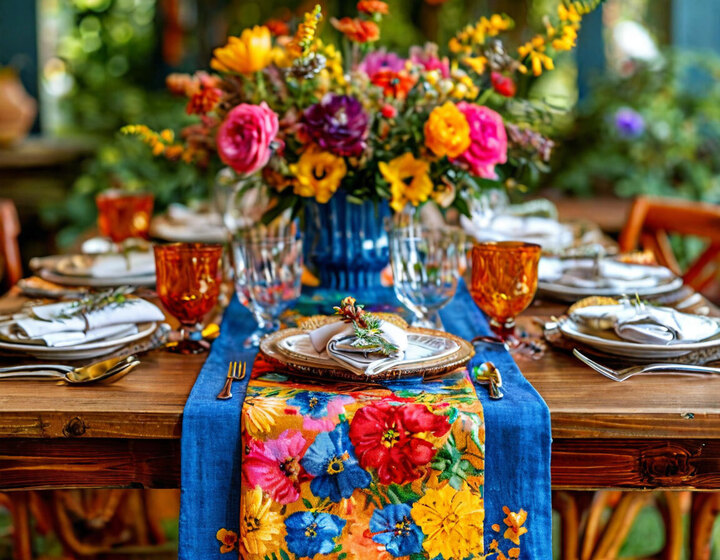 Для Масленицы подойдет яркая скатерть, лучше всего с традиционными узорами или рисунками в русском стиле — с цветами, солнцем, птицами или другими символами весны. Салфетки можно выбрать в тон скатерти или контрастных оттенков, например, красные или желтые, чтобы добавить яркости.