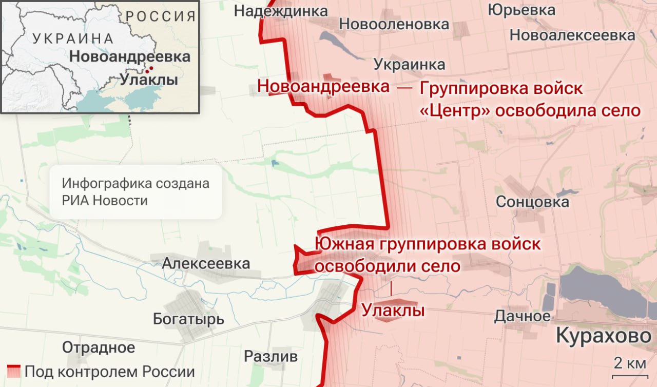 ▪️Российские военные освободили населенные пункты Улаклы и Новоандреевка в ДНР, сообщило Минобороны.