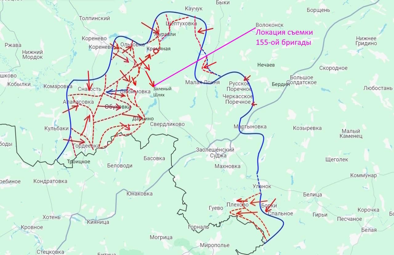 Российские военные тг-каналы публикуют видео, как заявляется, въезда их техники в соседний хутор Зеленый Шлях со стороны Коренево. Утверждается, что сопротивления им не оказывали.