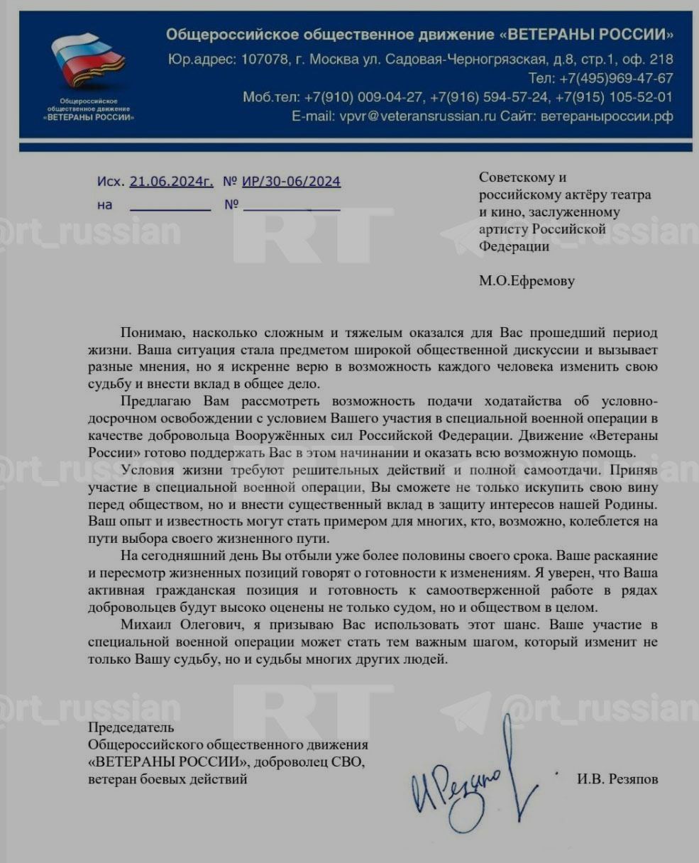 «Ветераны России» обратились к актёру с письмом (копия есть у RT). Они призывают его подать ходатайство и использовать шанс, чтобы «искупить вину перед обществом и внести вклад в защиту интересов Родины».