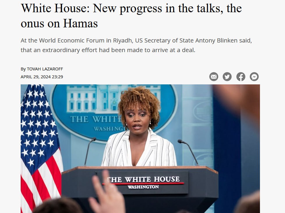 Как заявила пресс-секретарь Белого дома Карин Жан-Пьер, сейчас Израиль ждет ответа на очередное предложение, сделанное ХАМАС. Оно может привести к возвращению домой части заложников, а детали сделки уже обсудили президент Байден и премьер Нетаньяху.