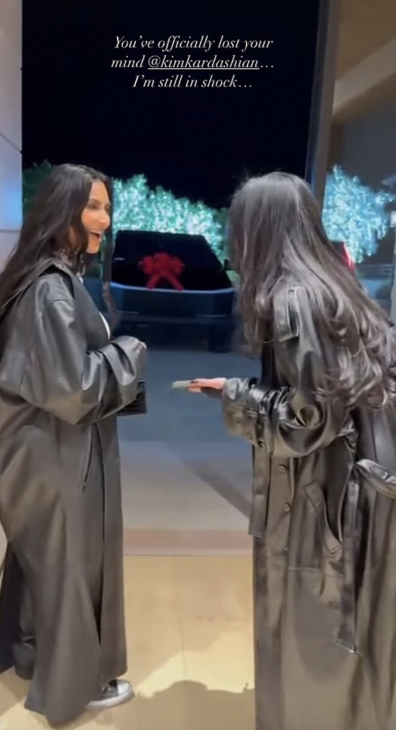 Перед тем, как подарить автомобиль, Ким позаботилась о его подарочной упаковке, поэтому Трейси получила машину, перевязанную ярким красным бантом. «Что! Ким, ты серьезно?! Ты сумасшедшая? Ты сошла с ума?» — эмоционально отреагировала подруга.