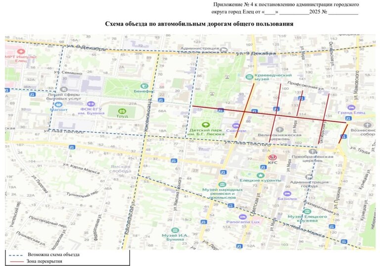 Кроме того, с 11:30 до 13:00 ограничение движения коснется и ряда улиц: на участках ул. Коммунаров (от ул. Маяковского до ул. М. Горького), ул. Октябрьской (от ул. Л. Толстого до ул. Профсоюзной), ул. Мира (от ул. Коммунаров до ул. Профсоюзной), ул. Ленина (от ул. Л. Толстого до ул. Профсоюзной) и ул. Советской (от ул. Л. Толстого до ул. Профсоюзной, за исключением общественного транспорта). Объезд также будет организован по автомобильным дорогам общего пользования согласно приложению № 4.