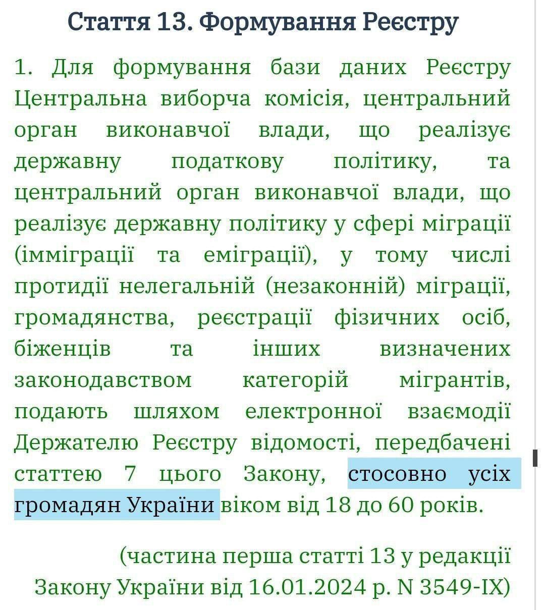 Π ΡΡΠ°ΡΡΠ΅ 13 Β«ΠΌΠΎΠ±ΠΈΠ»ΠΈΠ·Π°ΡΠΈΠΎΠ½Π½ΠΎΠ³ΠΎΒ» Π·Π°ΠΊΠΎΠ½Π°, ΠΊΠΎΡΠΎΡΡΠΉ ΠΠ΅Π»Π΅Π½ΡΠΊΠΈΠΉ ΠΏΠΎΠ΄ΠΏΠΈΡΠ°Π» 2 Π°ΠΏΡΠ΅Π»Ρ, Π΅ΡΡΡ Π½ΠΎΡΠΌΠ°, ΡΡΠΎ ΠΎΡΠ³Π°Π½Ρ Π²Π»Π°ΡΡΠΈ ΠΏΡΠ΅Π΄ΡΡΠ°Π²Π»ΡΡΡ Π΄Π°Π½Π½ΡΠ΅ Π Π΅Π΅ΡΡΡΠ° ΠΎΠ±ΠΎ Π²ΡΠ΅Ρ Π³ΡΠ°ΠΆΠ΄Π°Π½Π°Ρ Π£ΠΊΡΠ°ΠΈΠ½Ρ Π² Π²ΠΎΠ·ΡΠ°ΡΡΠ΅ ΠΎΡ 18 Π΄ΠΎ 60 Π»Π΅Ρ. ΠΡΠΎ ΠΎΠ·Π½Π°ΡΠ°Π΅Ρ, ΡΡΠΎ Π² ΡΠΏΠΈΡΠΎΠΊ Π²ΠΎΠ΅Π½Π½ΠΎΠΎΠ±ΡΠ·Π°Π½Π½ΡΡ ΠΌΠΎΠ³ΡΡ Π²ΠΏΠΈΡΠ°ΡΡ ΠΈ Π²ΡΠ΅Ρ ΠΆΠ΅Π½ΡΠΈΠ½ Π² Π²ΠΎΠ·ΡΠ°ΡΡΠ΅ ΠΎΡ 18 Π΄ΠΎ 60 Π»Π΅Ρ.