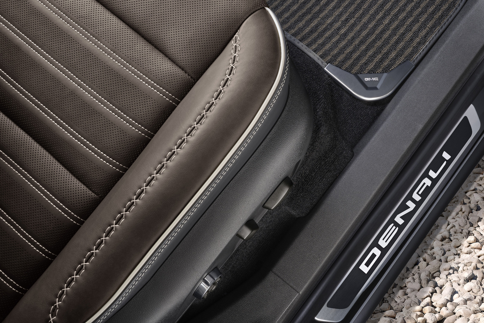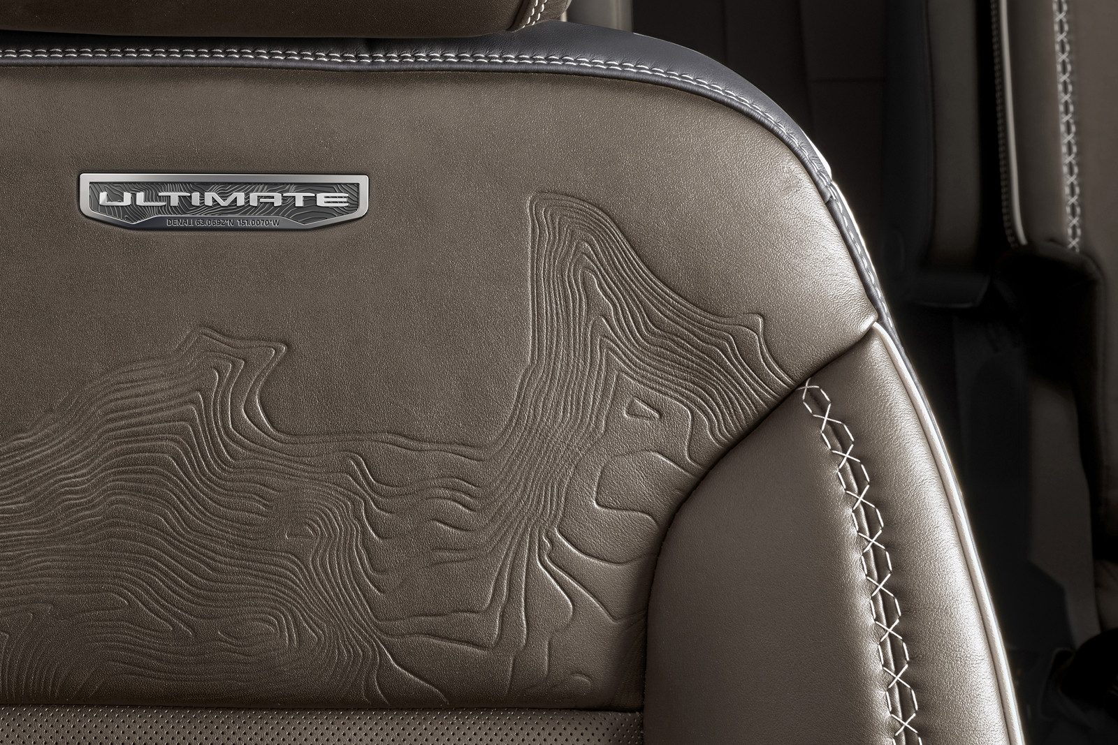 В салоне GMC Acadia Denali Ultimate предусмотрены стандартная кожаная отделка с рисунком в виде рельефа на топографической карте и необычной контрастной прострочкой, а также подогрев, вентиляция и функция массажа передних кресел. Аналогичные узоры есть на внутренней отделке дверей, а также они выгравированы на древесной вставке, расположенной на передней панели.