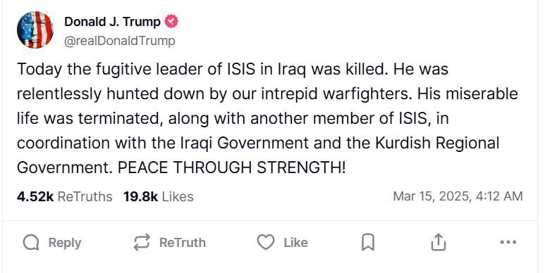 Сегодня был убит беглый лидер ИГИЛ в Ираке. Его неустанно выслеживали наши бесстрашные бойцы. Его жалкая жизнь была прервана вместе с другим членом ИГИЛ в координации с иракским правительством и курдским региональным правительством. МИР ЧЕРЕЗ СИЛУ!