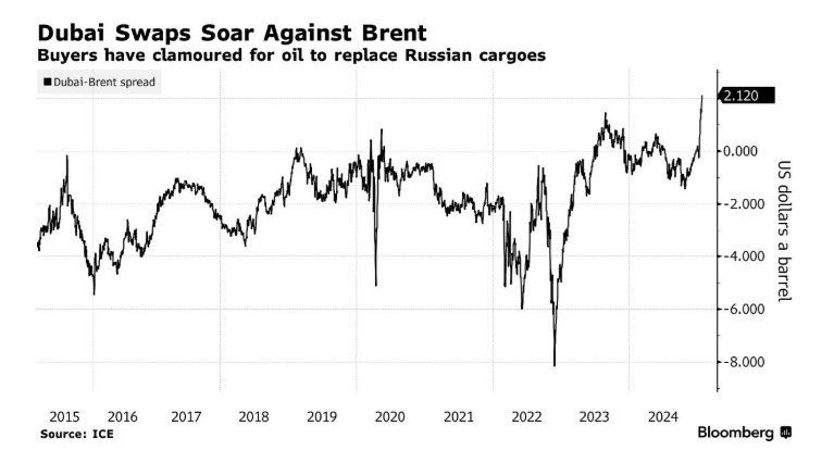 В обычное время нефть из Дубая и соседних регионов торгуется с дисконтом к Brent, так как ее переработка для производства таких продуктов, как бензин и дизель, обходится дороже. Однако покупатели из Индии и Китая настолько активно скупают ближневосточные ресурсы, что цены взлетели до чрезвычайно высоких уровней. @banksta