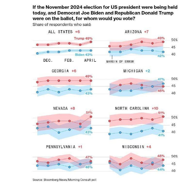 📊Последние опросы Bloomberg показывают нарастающее преимущество Дональда Трампа над Джо Байденом в ключевых штатах