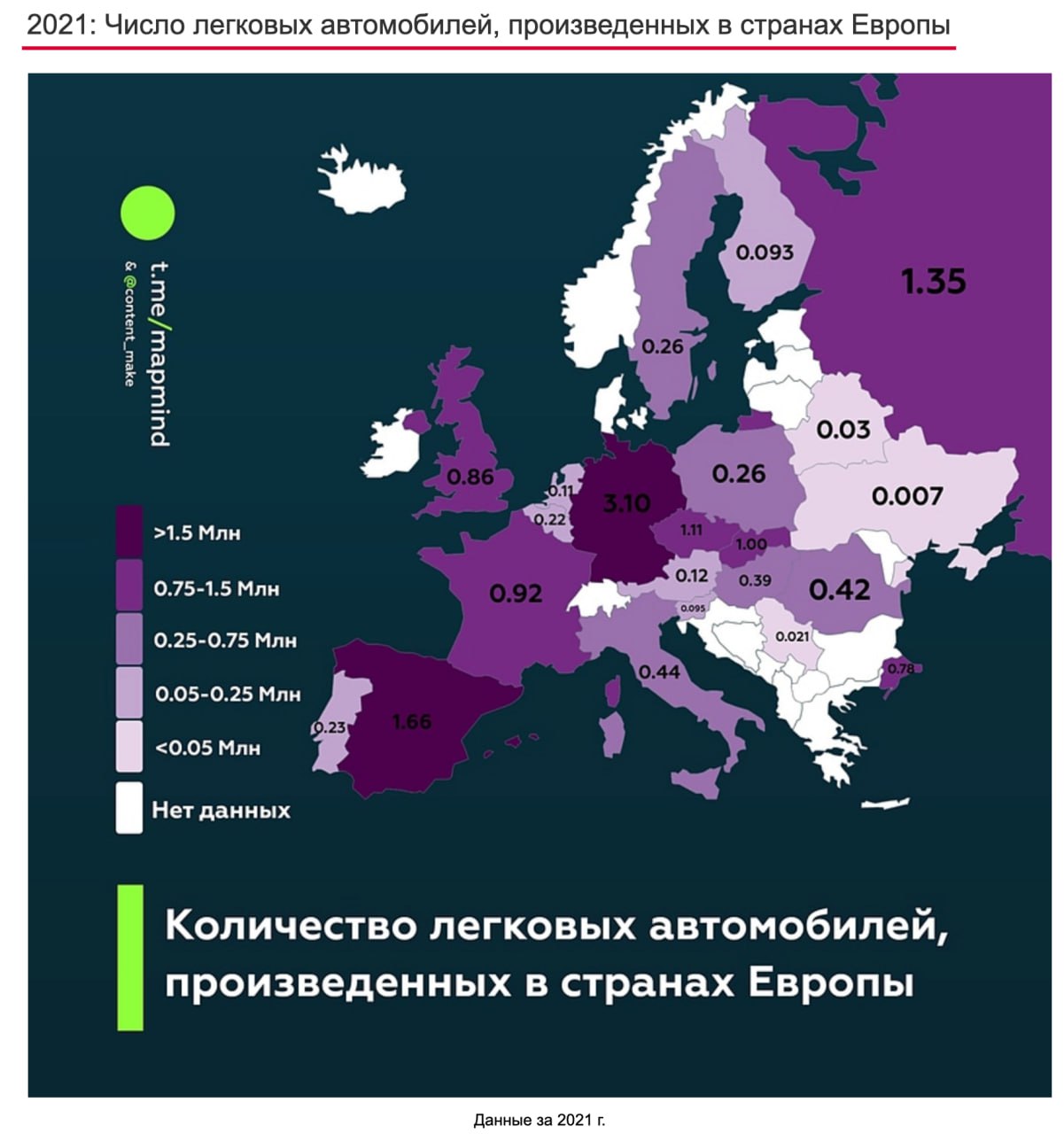 Кстати, интересная статистика. На 2021 год в Европе больше чм в РФ автомобилей собирали только в двух странах: Германия и Испания.