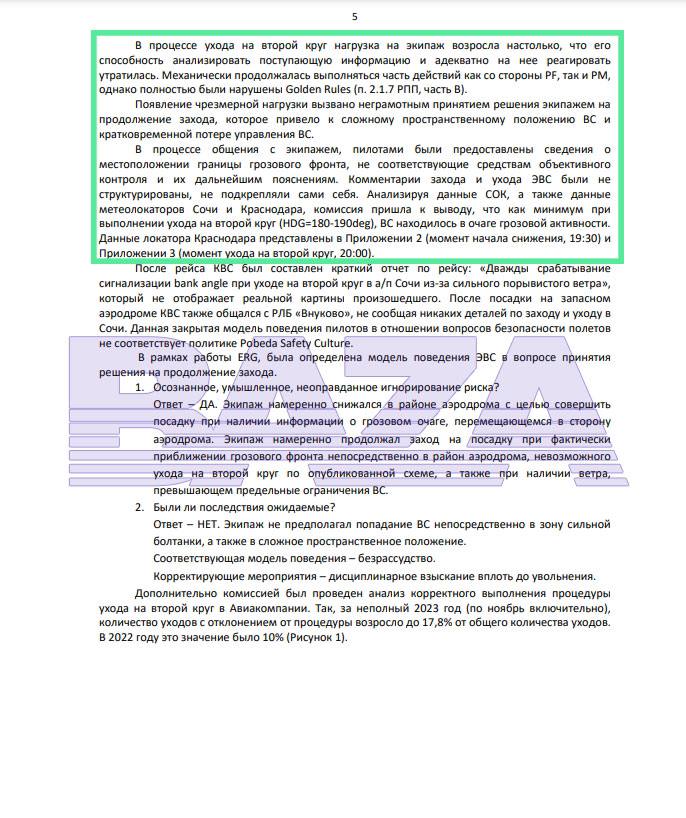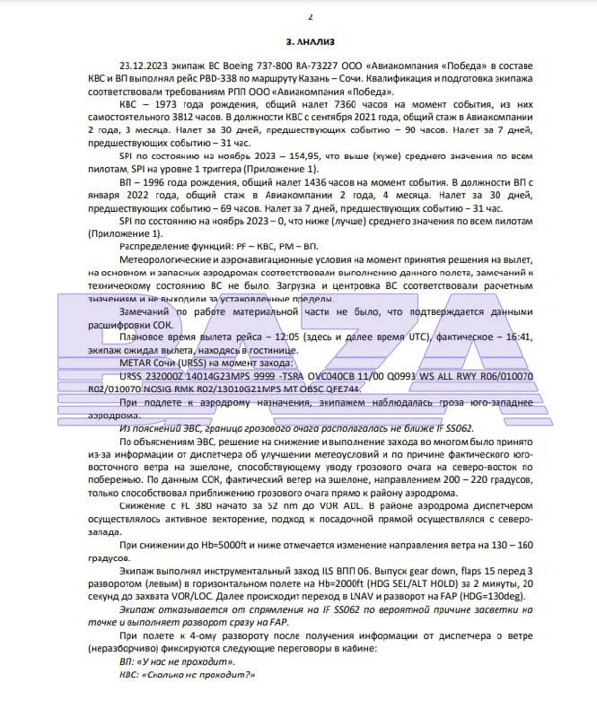 23 декабря 2023 года самолёт «Победы» совершал рейс из Казани в Сочи. Уже при заходе на посадку борт попал в сильную грозу. Согласно расшифровке переговоров, 27-летний второй пилот несколько раз предлагал 50-летнему командиру уйти на второй круг, однако тот всё никак не решался это сделать.