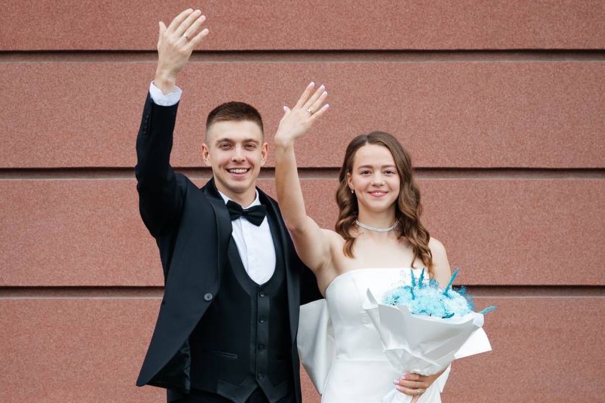 21 сентября возлюбленные расписались в загсе в окружении самых близких. Евгений надел смокинг, а Любовь — скромное белое коктейльное платье. Особым был букет невесты – из голубых хризантем. Выбран он был не случайно: именно такие цветы биатлонистке дарил возлюбленный в начале отношений.