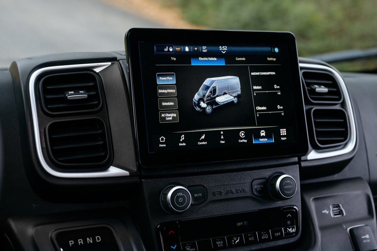 ProMaster EV оснащается единственным 272-сильным электромотором, который расположен на передней оси; его максимальный крутящий момент равен 409 Нм. Такой фургон получил тяговую батарею ёмкостью 110 кВт*ч, запас хода на одной зарядке составляет 261 км.
