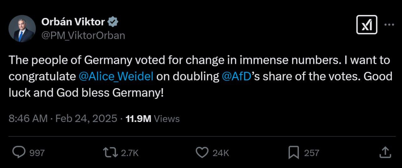 ππΊ ΠΡΠ΅ΠΌΡΠ΅Ρ ΠΠ΅Π½Π³ΡΠΈΠΈ ΠΡΠ±Π°Π½ ΠΏΡΠΎΠΈΠ³Π½ΠΎΡΠΈΡΠΎΠ²Π°Π» ΠΏΠΎΠ±Π΅Π΄Ρ Π₯ΠΠ‘ ΠΈ Π²ΠΌΠ΅ΡΡΠΎ ΡΡΠΎΠ³ΠΎ ΠΏΠΎΠ·Π΄ΡΠ°Π²ΠΈΠ» ΠΠ΄Π ΠΈ Π΅Π΅ Π»ΠΈΠ΄Π΅ΡΠ° ΠΠ»ΠΈΡΡ ΠΠ°ΠΉΠ΄Π΅Π»Ρ Ρ ΠΈΡΡΠΎΡΠΈΡΠ΅ΡΠΊΠΈΠΌ ΡΠ΅Π·ΡΠ»ΡΡΠ°ΡΠΎΠΌ