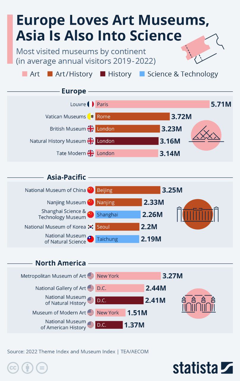 📊Наиболее посещаемые художественные и научные музеи по континентам (среднее число посетителей в год в 2019–2022 гг.)