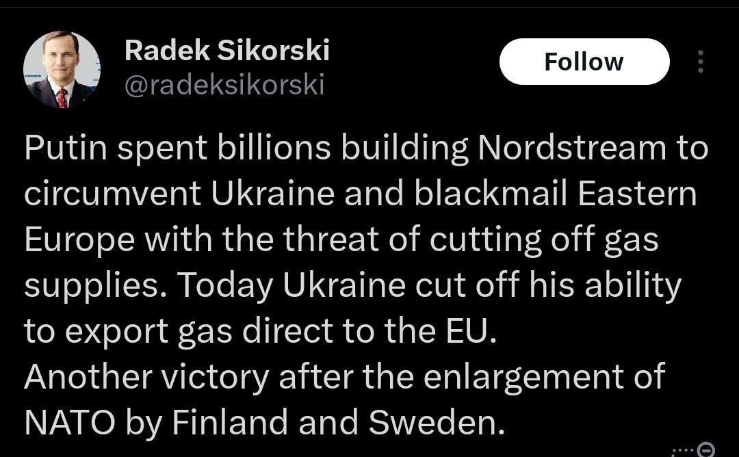 Проамериканский министр Польши Сикорский: "Путин потратил миллиарды на строительство "Северного потока", чтобы обойти Украину и шантажировать Восточную Европу угрозой прекращения поставок газа. Сегодня Украина лишила его возможности напрямую экспортировать газ в ЕС. Еще одна победа после расширения НАТО Финляндией и Швецией".