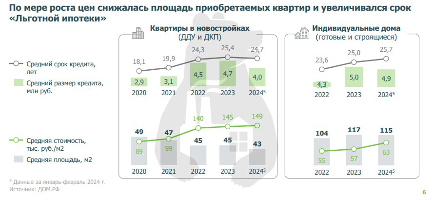 Средняя площадь квартир по льготной ипотеке под 8% за 4 года снизилась с 49 до 43 м², при этом цены на новостройки выросли почти в 2 раза, подсчитал оператор программы ДОМ.PФ. Чтобы осилить покупку квартиры, люди соглашались на снижение приобретаемой площади и все более длительный срок кредита. О том, почему на рынке возник перекос, мы уже писали.