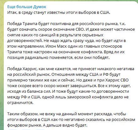 Такой впечатляющий рост было вызван главным образом победой Трампа на выборах в США. Не один раз до выборов и сразу после них писал, что такой исход очень позитивно скажется на российском фондовом и долговом рынке. А что самое интересное, не было никаких рисков находиться в лонге перед выборами - ведь победа Трампа привела бы к росту рынка, а победа Харрис не привела бы к его падению. Обращал на это внимание в приватном канале. Внизу прикрепил скрин поста оттуда.
