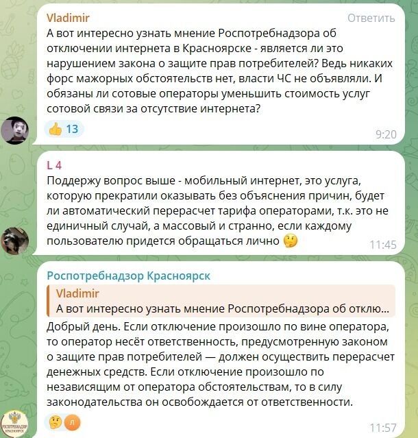 Вопрос оставил пользователь Владимир под постом в телеграме. Он спросил, считает ли ведомство отключение интернета нарушением закона.